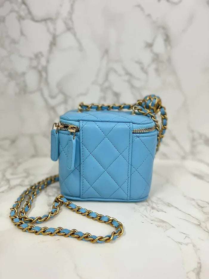 ❤️Chanel Bright Blue Mini Square Vanity Bag with Leather Chain Pearl Crush GHW